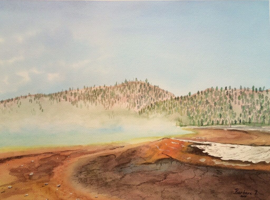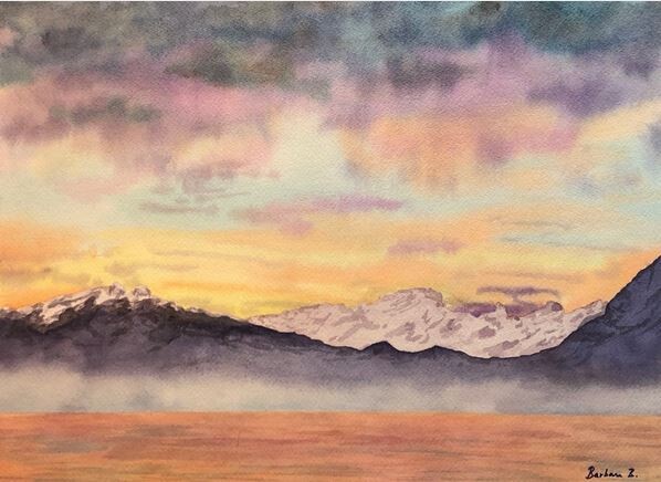 .Barbara B..: Je ramène plein de photos de mes vacances, d’Australie et d’Amérique de l’ouest, en particulier du Grand Canyon et de mes escapades en Suisse. Les paysages et les rencontres sont pour moi la promesse de nouvelles sources d’inspiration. Je peins à l’aquarelle d’après mes photos sur des feuilles en coton de 300 g. J’utilise des blocs d’aquarelle Arches de formats A4 et A3 et une trentaine de pinceaux. Ma palette est limitée à six couleurs de base: deux rouges, deux bleus, deux jaunes.