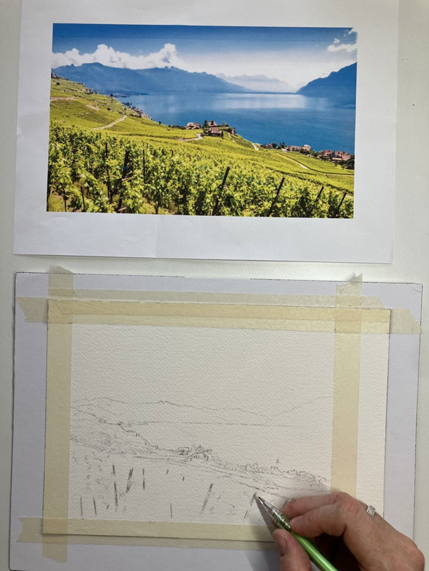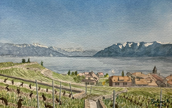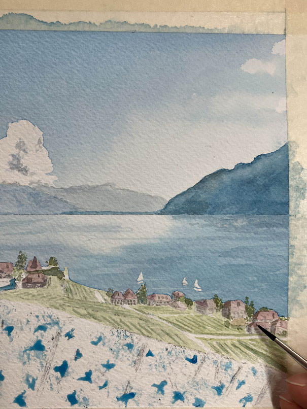 Par exemple, pour cette aquarelle, la personne a demandé l’ajout de voiliers et a souhaité réduire la brume sur les montagnes. Elle a été peinte en format A5 car c’était un petit cadeau à offrir à sa famille qui vit à l’étranger.